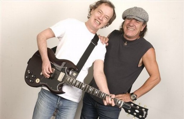 Angus Young, left, and Brian Johnson of AC/DC photographed in New York on Tuesday, Sept. 9, 2008. (AP Photo/ Jim Cooper)